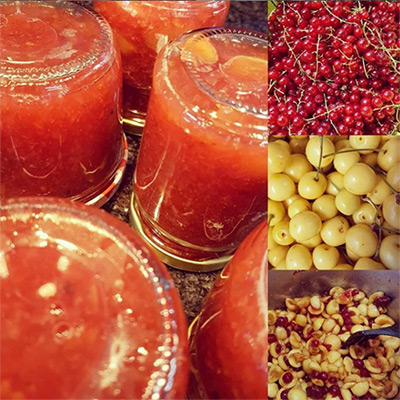 De rijkelijk gevulde tafel staat vol met brood, croissants, zelfgemaakt confituur, vers fruit en veel meer.